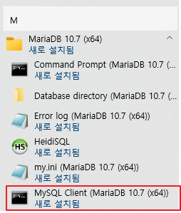 7. 시작표시에서 추가된거가 확인되는데 MySQL Client 클릭후 비밀번호 입력시 접속 가능