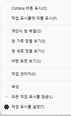 그 후 작업표시줄에 마우스를 대고 우클릭을 하면 아래와 같이 뜬다.