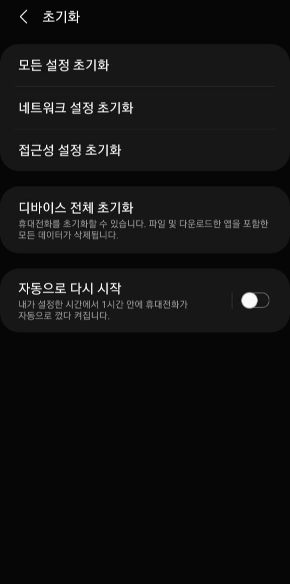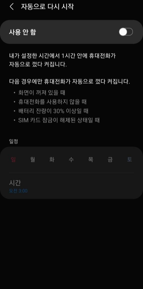 설정 > 일반 > 초기화 > 자동으로 다시 시작 > 사용