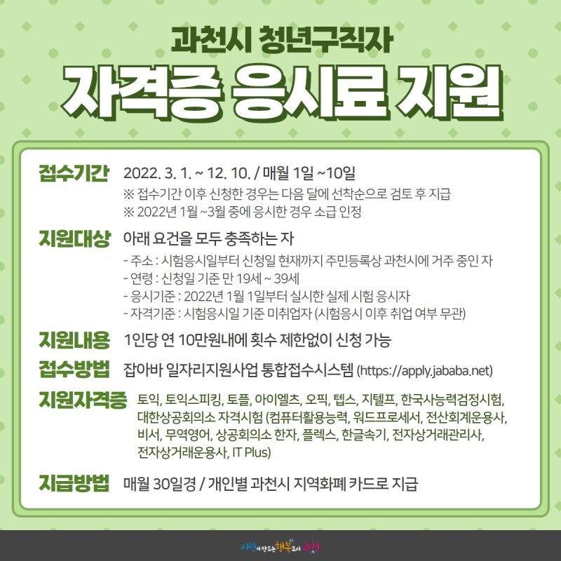 ○ 지급방법 : 개인별 과천시 지역화폐 카드로 해당 응시료 지급