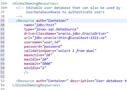 아래의 resource를 맞게 수정하여 <GlobalNamingResources></GlobalNamingResources> 태그 안에 넣는다.
