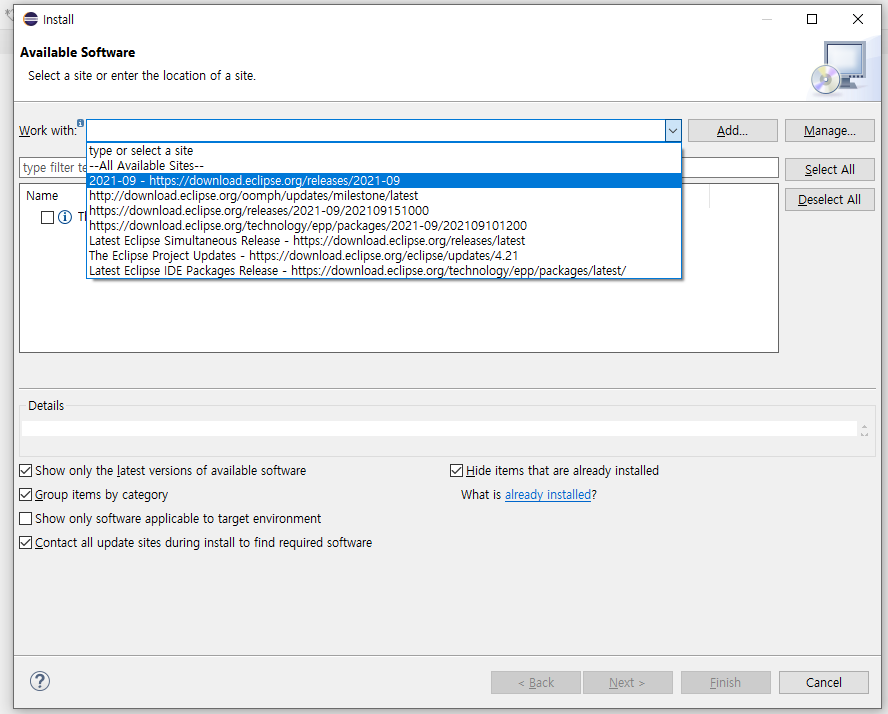 2. work with : 에서 아래 화살표 누른 후 설치된 이클립스 버전 써있는 저거 선택
