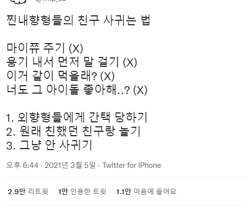 “찐내향형들의 친구 사귀는 법 마이쮸 주기 (X) 용기 내서 먼저 말 걸기 (X) 이거 같이 먹을래? (X) 너도 그 아이돌 좋아해..? (X) 1. 외향형들에게 간택 당하기 2. 원래 친했던 친구랑 놀기 3. 그냥 안