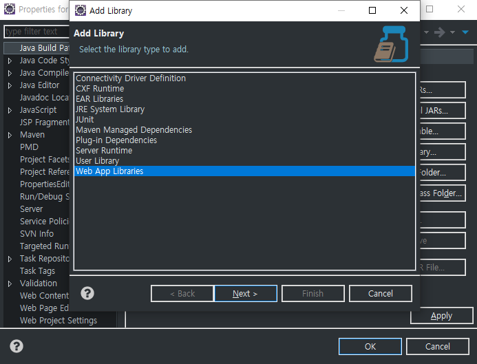 하면 기존 프로젝트에 있던 WEB-INF/lib 안에 있는 라이브러리가 추가 되어 앞에 빨간 엑스도 사라지고,