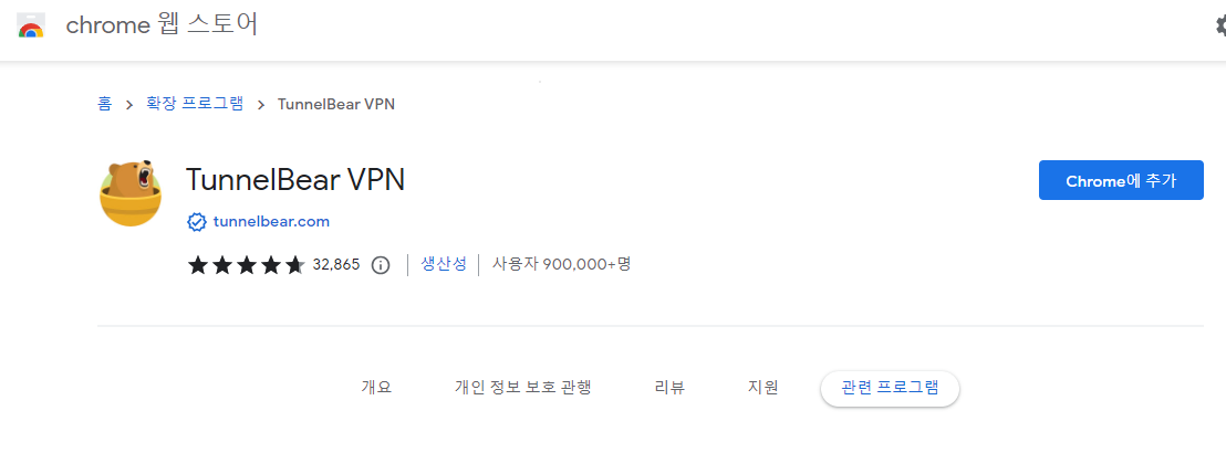 위에 링크로 들어가서 TunnelBear VPN 를 Chrome에 추가 한다.
