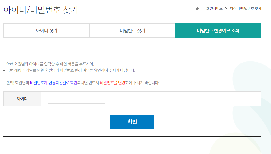 아이디/비밀번호 찾기에서 세번째 탭에 보면 비밀번호 변경여부 조회가 있다.