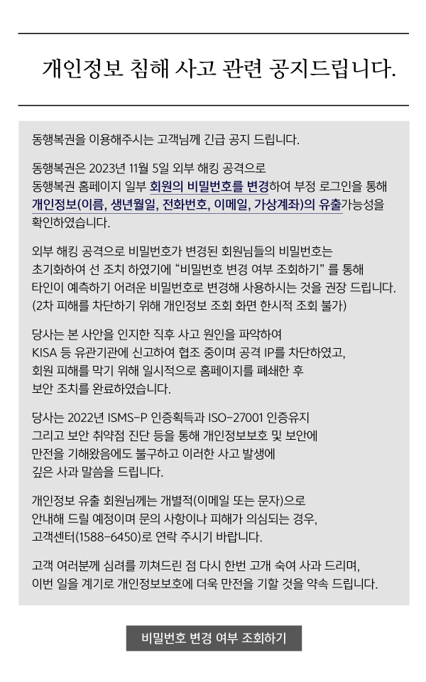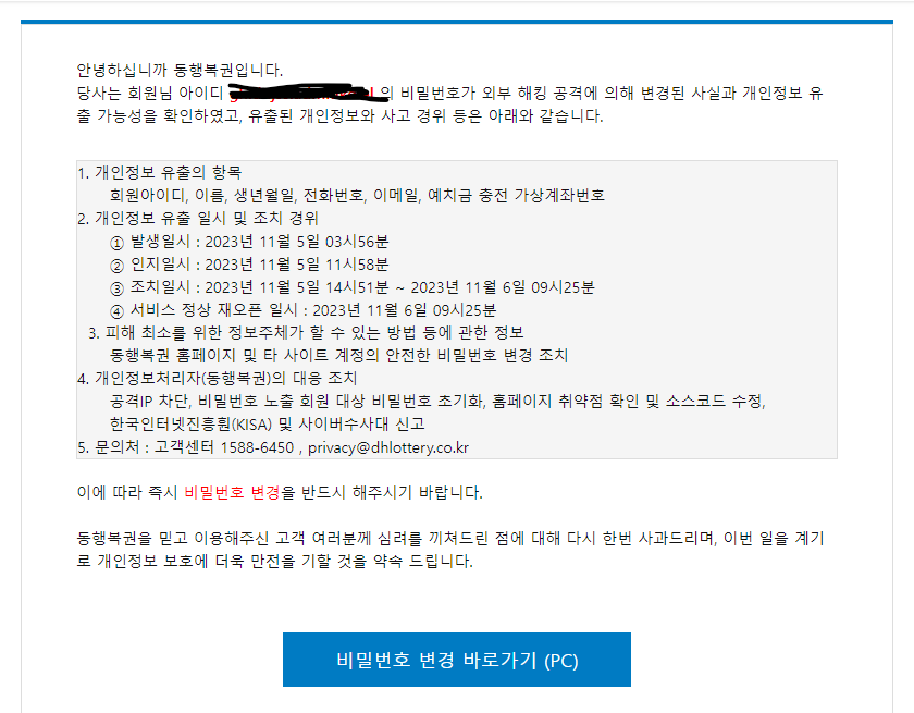 | 1. 개인정보 유출의 항목 회원아이디, 이름, 생년월일, 전화번호, 이메일, 예치금 충전 가상계좌번호 2. 개인정보 유출 일시 및 조치 경위 ① 발생일시 : 2023년 11월 5일 03시56분 ② 인지일시 : 2023년 11월 5일 11시58분 ③ 조치일시 : 2023년 11월 5일 14시51분 ~ 2023년 11월 6일 09시25분 ④ 서비스 정상 재오픈 일시 : 2023년 11월 6일 09시25분 3. 피해 최소를 위한 정보주체가 할 수 있는 방법 등에 관한 정보 동행복권 홈페이지 및 타 사이트 계정의 안전한 비밀번호 변경 조치 4. 개인정보처리자(동행복권)의 대응 조치 공격IP 차단, 비밀번호 노출 회원 대상 비밀번호 초기화, 홈페이지 취약점 확인 및 소스코드 수정, 한국인터넷진흥훤(KISA) 및 사이버수사대 신고 5. 문의처 : 고객센터 1588-6450 , privacy@dhlottery.co.kr |