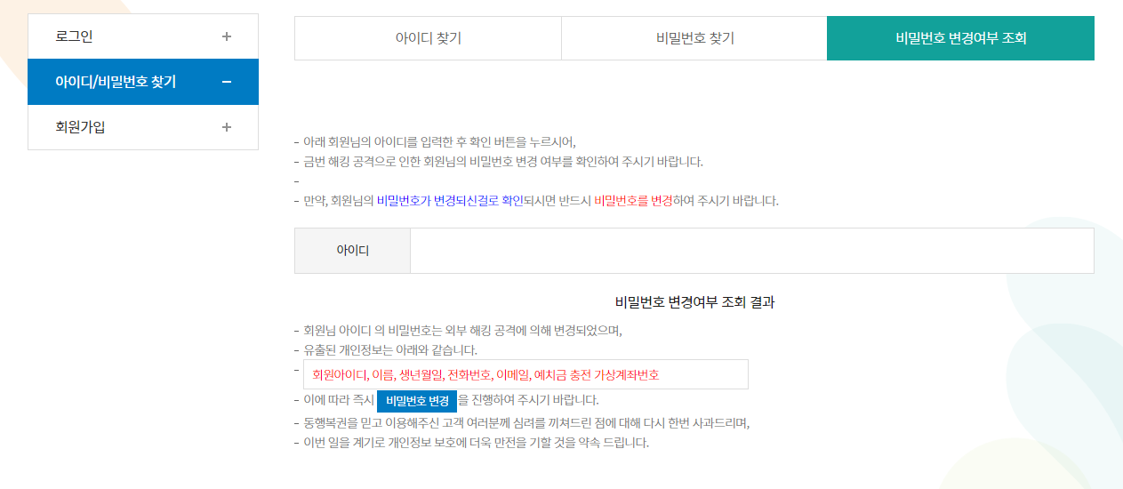 | 안녕하십니까 동행복권입니다. 당사는 회원님 아이디 aaaaaaaaaa 의 비밀번호가 외부 해킹 공격에 의해 변경된 사실과 개인정보 유출 가능성을 확인하였고, 유출된 개인정보와 사고 경위 등은 아래와 같습니다. |