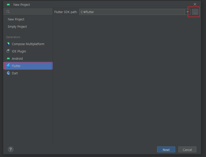 4. 생성화면에서 아래 Generators > Flutter의 path 를 잡아준다. > Next