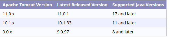 | Apache Tomcat Version | Latest Released Version | Supported Java Versions |