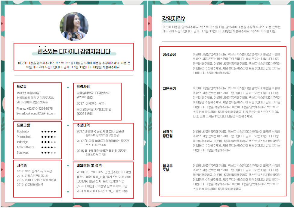 위에 다운받은 이력서 피피티 템플릿에서는 제목(한줄소개), 프로필, 프로그램, 자격증, 학력경험, 수상내역, 대외활동 및 경력, 뒤쪽에 자기소개 이렇게 8가지가 나와있다.