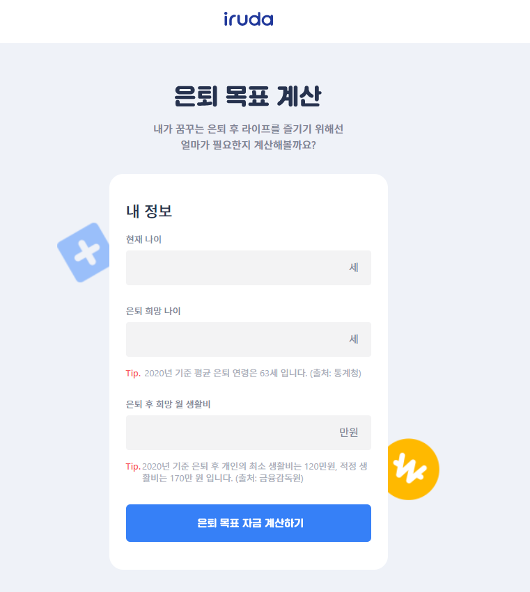 현재 나이, 은퇴 희망 나이, 은퇴 후 희망 월 생활비를 작성하고 계산하기 하면 나옴