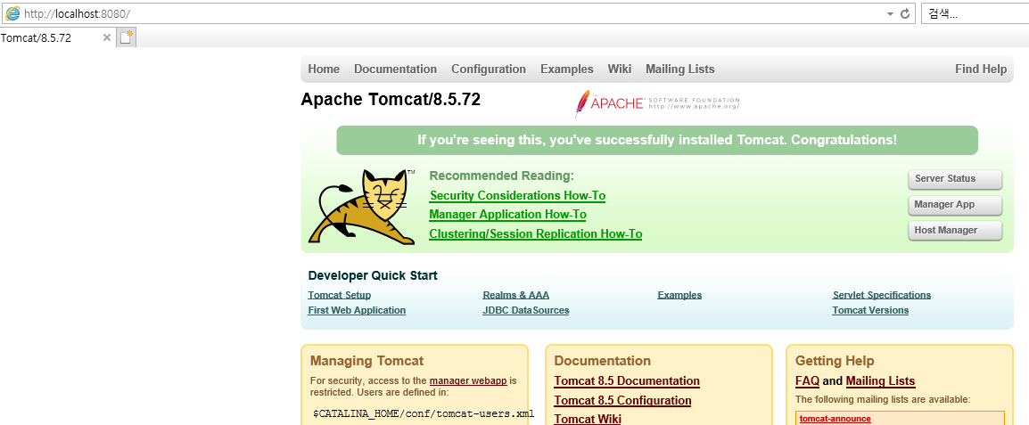 웹브라우저로 http://localhost:8080 접속 해서 아래와 같은 화면이 뜨면 성공